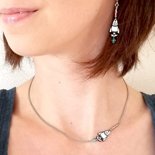 Collier rocket, court et fin gravée en noir et blanc d’après mon illustration.